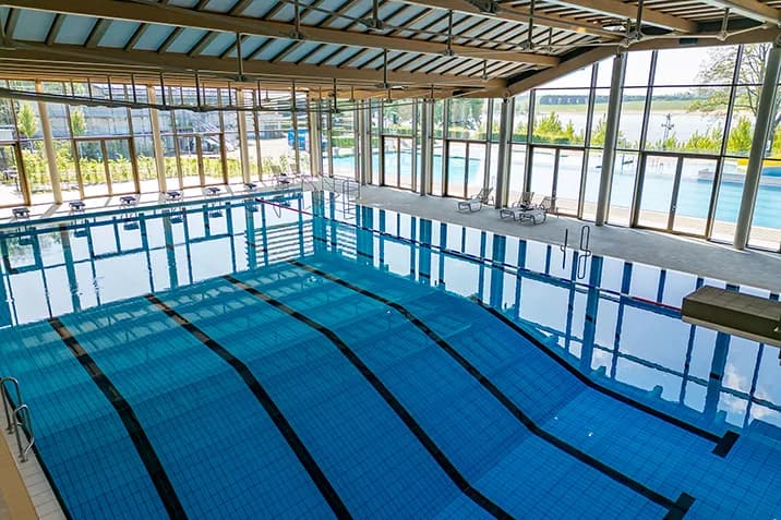 Entdecken Sie unser vielseitiges Hallenbad mit einem 25-Meter-Sportbecken inklusive Sprungbrett und -plattform, einem Erlebnisbecken mit Lazy-River, Sprudelliegen und Schwallduschen sowie einer 80 Meter langen Röhrenrutsche. Für Schwimmkurse steht ein Kursbecken mit Hubboden bereit, während unser Lehrschwimmbecken und der Kleinkindbereich mit spannenden Spiel- und Wasserattraktionen für Spaß bei den Kleinsten sorgen.