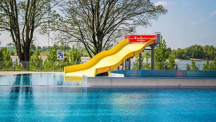 Unser kinderfreundliches Rheinbad bietet ein speziell gestaltetes Kinderbecken. Das besonders flache Wasser mit bunten Spielhütten und zwei Kleinkindrutschen sorgen für sicheren Spaß und unvergessliche Familienmomente in unserem Schwimmbad!
