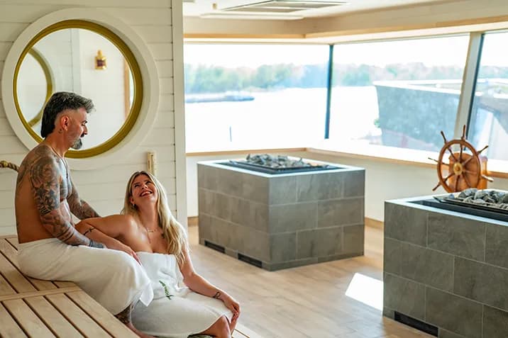 Verschiedene Aufgüsse, direkter Blick auf den Rhein und Entspannungsmusik