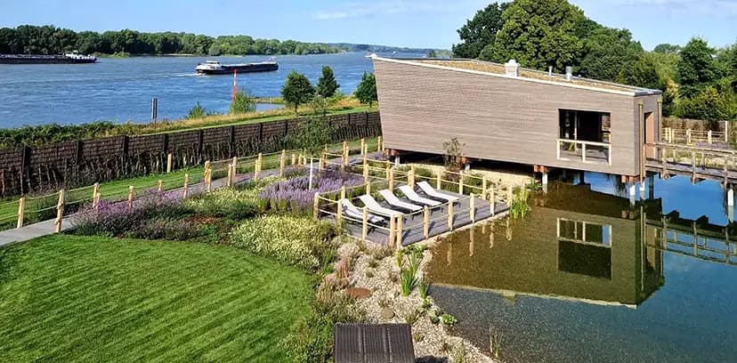 Genießen Sie den atemberaubenden Panoramablick auf den Rhein, während Sie in der wohligen Wärme der Sauna schwitzen. Erreichbar ist die Bootshaussauna über einen langen Steg, der über den Saunateich führt.